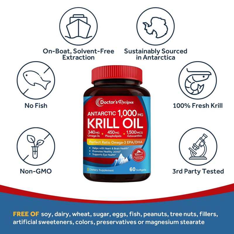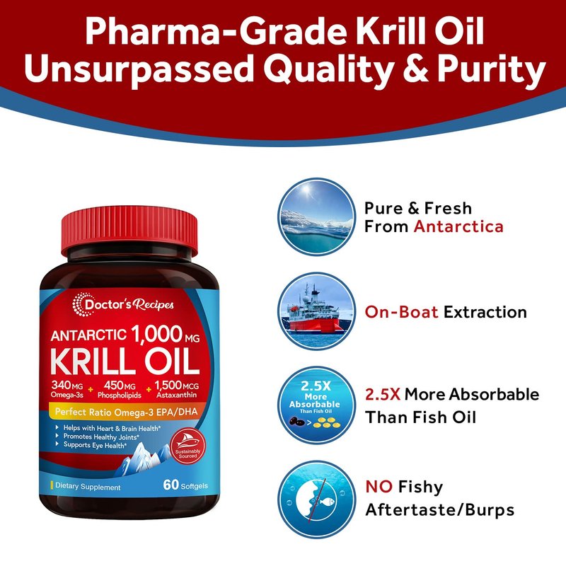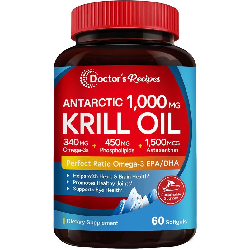 Doctor's Recipes Antarctic Krill Oil Omega 3 Supplement, 1000mg Softgels, DHA:EPA at 1:2 Perfect Ratio, 1.5mg Astaxanthin, Clean Extraction, No Fish Taste, Joint, Brain, Eye Health, Non-GMO