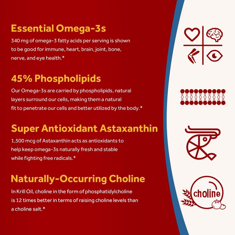 - Boost Omega-3 Levels*: Most Americans (up to 70%) are deficient in essential Omega-3s because they do not eat enough fish. Supplementing extra Omega-3s is of great significance for cognitive functions.* Krill oil is unquestionably the greater source of Omega-3s since it contains fewer impurities and is 2.5x more absorbable than fish oil. 1,500mcg of Astaxanthin also adds immense antioxidant potential in neutralizing free radicals & helping to prevent cellular damage.*