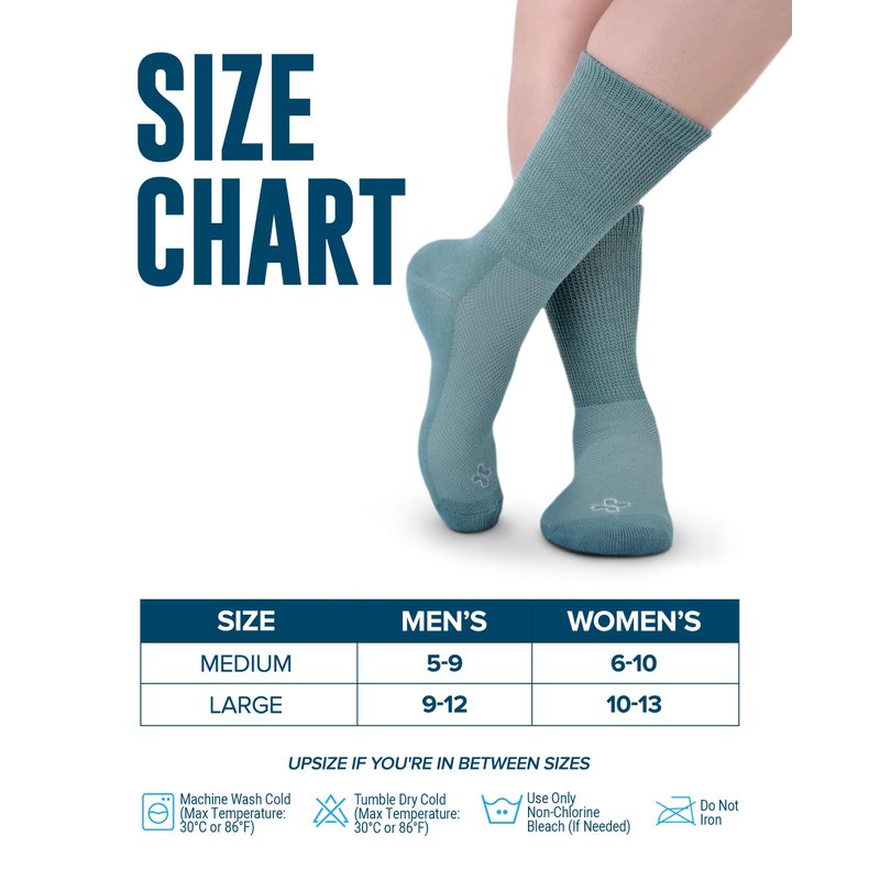 - Sizing Information – Medium size fits mens size 5-9 and womens 6-10. Large size fits diabetic socks for men 9-12 and womens size 10-13.
