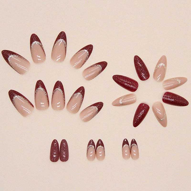 - 【Package Contains】DOCVOEOMH french burgundy press on nails medium almond shaped contains 24Pcs full cover fake nails with gold glitter design, 1* nail file, 1*wooden stick, and 24 jelly glues. The almond shape fake nails are divided into 12 different sizes