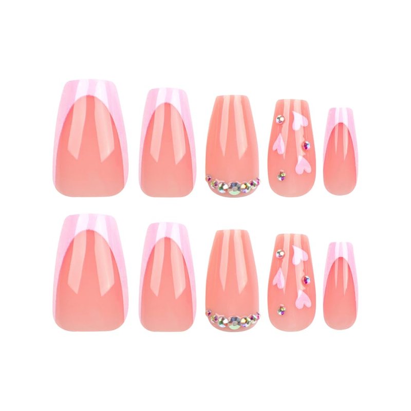 DOCVOEOMH Press on Nails Short Medium Coffin French Pink Acrylic Fake Nails with Rhinestones Heart Design Glue on Glossy Full Cover Artificial Gel False Stick on Nail for Girls Women Wedding 24Pcs