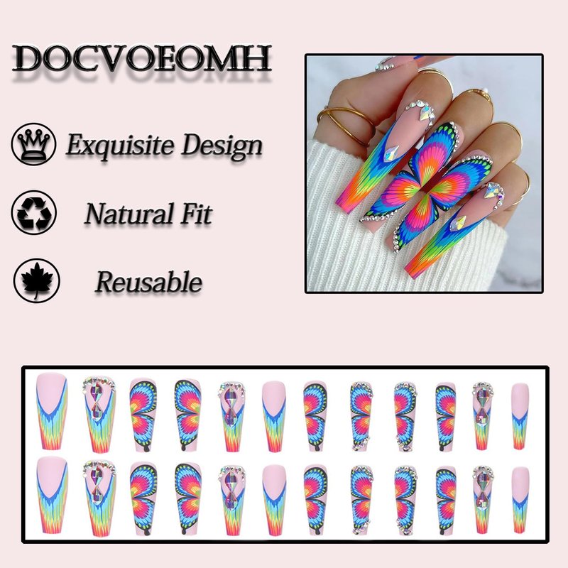 DOCVOEOMH Square Press on Nails Long Rainbow Butterfly Fake Nails with Rhinestones Design Full Cover French Acrylic False Stick Glue on Nails for Women and Girls 24PCS