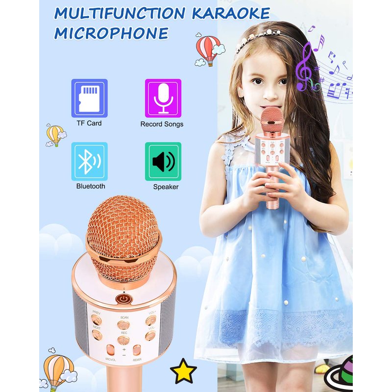 - 𝄞 Magic Sound: The karaoke microphone is interesting toys for kids bringing so much fun! Our karaoke microphone has 4 magical sounds including child voices, tough voices, male voices and honey voices. Let kids enjoy magical singing and glue to this present.
