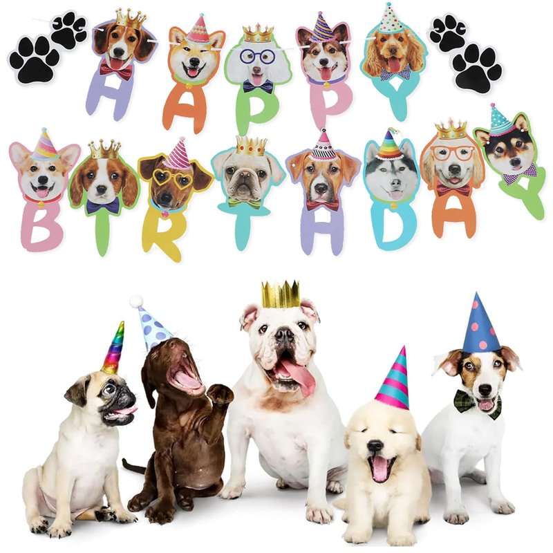 - Dog Party Decorations Include: 1 dog themed birthday party decorations banner,1 cake topper, 16 Pcs cupcake toppers, 9 Pcs “Lets Pawty” letter balloons, 4 Pcs paw print balloons, 1 bone balloons, 2 Pcs dog balloons