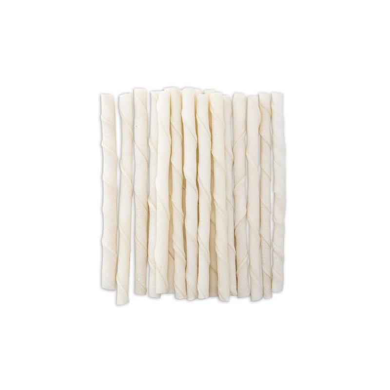 Rawhide Chew Twist Dog Treats Natural Rawhide Twists are tasty twisted rawhide treats for dogs. Made with natural, premium-quality rawhide for a delicious taste. Thick braided Natural Rawhide Twists naturally clean teeth as dogs chew. Made of natural, premium-quality rawhide Each twist measures 5"L x ¼"W Choose Packs of; 10, 25, 50, 100, 200