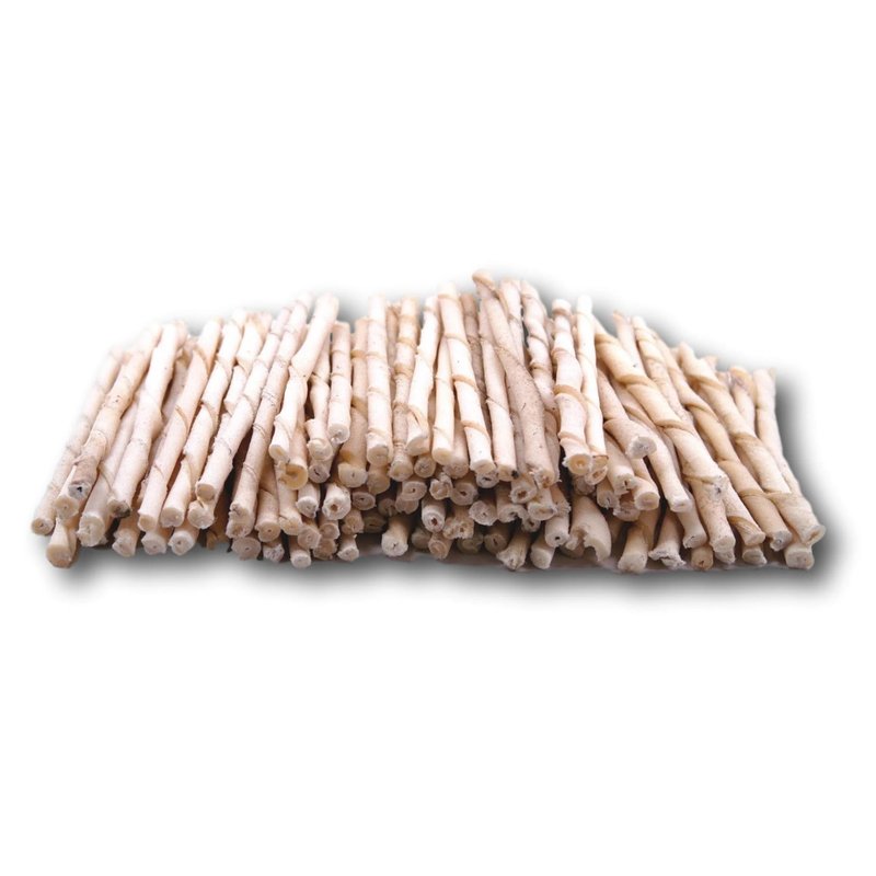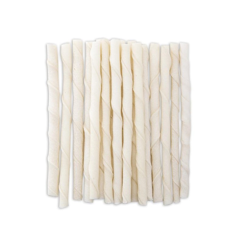 Rawhide Chew Twist Dog Treats Natural Rawhide Twists are tasty twisted rawhide treats for dogs. Made with natural, premium-quality rawhide for a delicious taste. Thick braided Natural Rawhide Twists naturally clean teeth as dogs chew. Made of natural, premium-quality rawhide Each twist measures 5"L x ¼"W Choose Packs of; 10, 25, 50, 100, 200