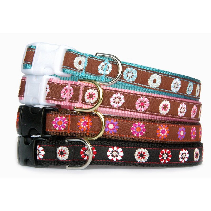 5/8" or 3/4" wide dog collar for puppy, small dogs to large dogs. Mod style geometric floral ribbons are sewn on durable and flexible nylon backing in coordinated color. These ribbons are feminin and stylish, great for girl dogs! White color curved buckle for turquoise and pink collars looks very crisp and clean. This white buckle does not get dirty easly. And whole collar itself is machine or hand washable. They are fashionable and practical for everyday use. All of Marityn Dog's products are handcrafted here in USA . And we choose to use animal friendly materials. (No leather, No fur) Compassion for all creatures... Color choice : from top of the picture (Turquoise) (Pink) (Brown) (Black)