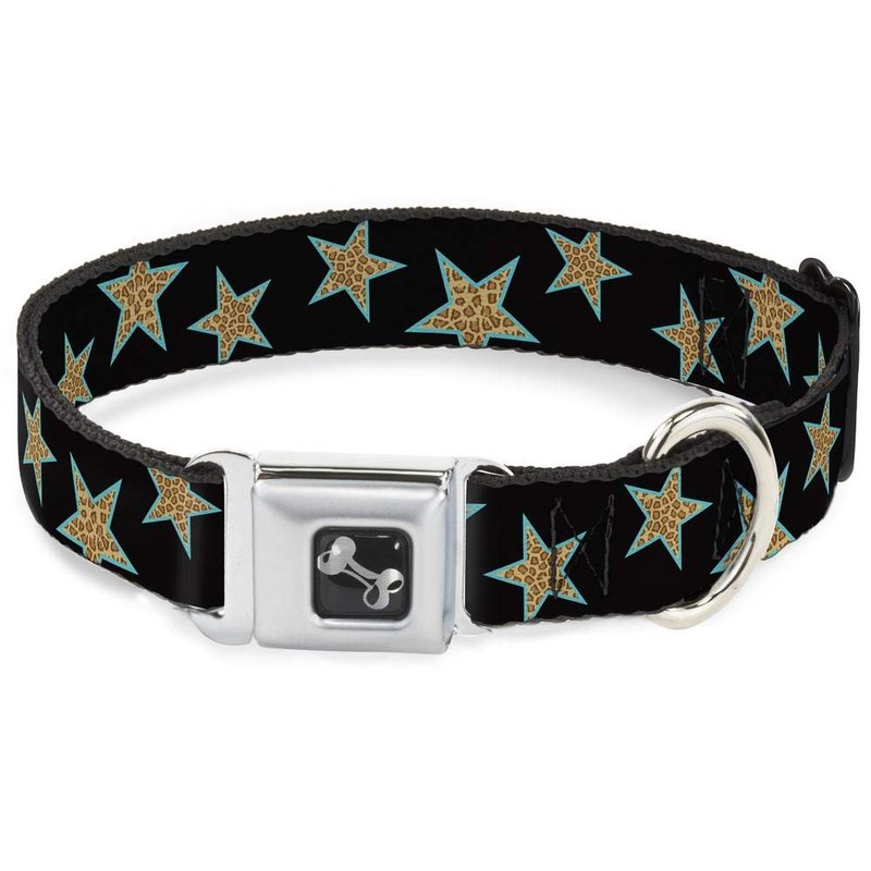 - Style: Buckle-Down Seatbelt Buckle Dog Collar - Multi Stars Black/Leopard/Baby Blue Outline - 1.5" Wide - Fits 16-23" Neck - Medium