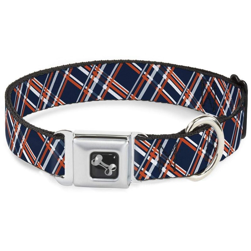 - Style: Buckle-Down Seatbelt Buckle Dog Collar - Plaid X3 Navy/Orange/White - 1.5" Wide - Fits 18-32" Neck - Large