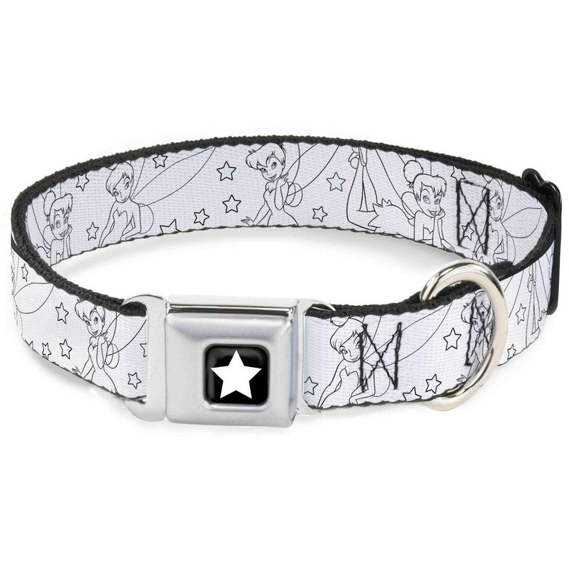 - Style: Buckle-Down Seatbelt Buckle Dog Collar - Tinker Bell Poses/Stars Outline White/Black - 1.5" Wide - Fits 13-18" Neck - Small