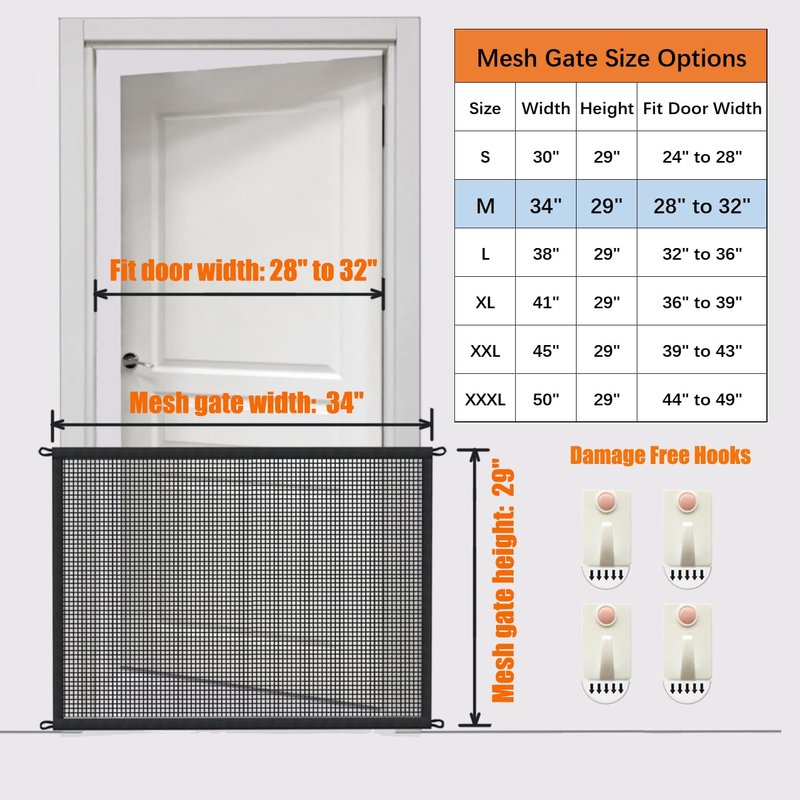 - Easy to Install: This dog gate measures 29" x34" and is a perfect fit for gate widths ranging from 26" to 32". Installing this magic pet gate is a breeze - simply attach four hooks on both sides of the gate and utilize the four elastic hooks on the mesh gate to effectively secure the gate in place.