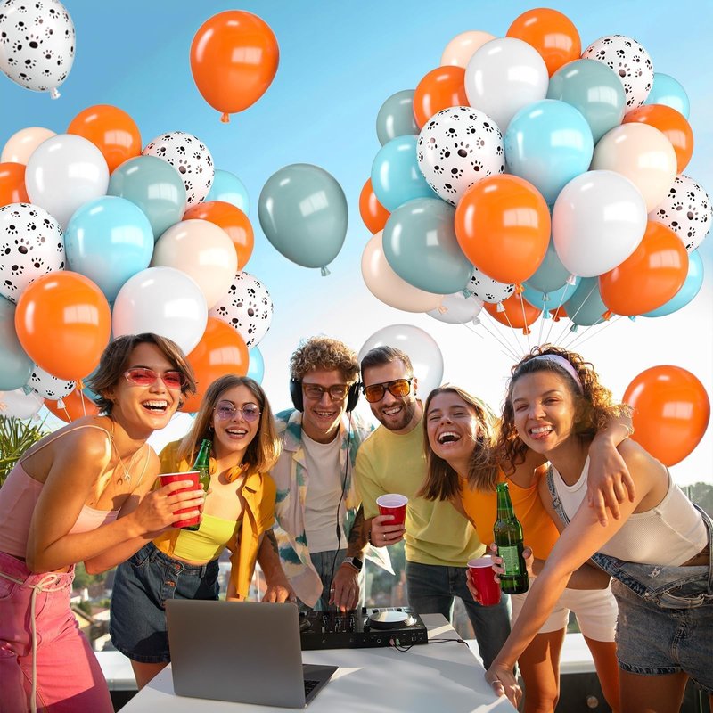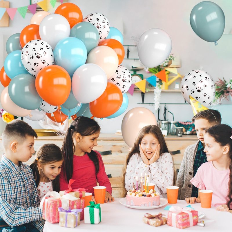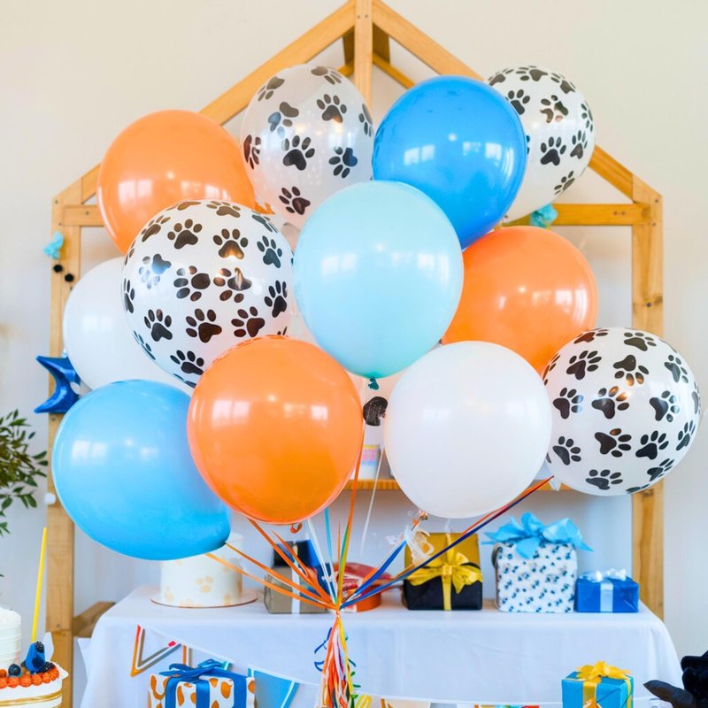 - Dog Paw Balloons Kit:30pcs 12 inch orange and blue balloons, including 5 ice mist blue balloons,5 teal balloons,5 matt orange balloons,5 maca orange balloons,5 matt white balloons,5 dog paw printed balloons,1 white ribbons 10 meters long.