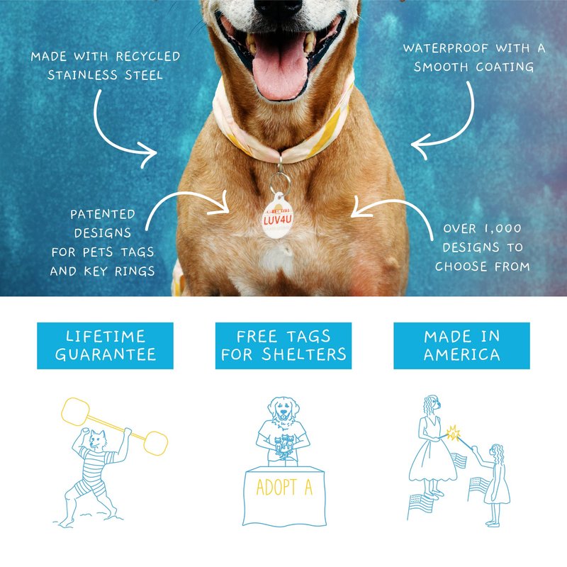 A rainbow symbolizes a lot, whether it's hope at the end of the storm or freedom to love whom you want. Celebrate nature's most spectacular display with these gorgeous pet ID tag designs that pop and shine with color in any season. Dog Tag Art pet ID tags are made of high-quality recycled stainless steel and are permanently infused with full-color graphics and personalized text, so they won’t rub off over time, unlike cheaper competitors’ tags. With our innovative infused design, there are no glued or “sandwiched” materials that quickly wear out or fall apart. Our dog ID tags are fully customizable for your pet’s name, your phone number, and other vital information. Each tag also comes with a strong key ring to easily attach to your pet's collar. Our fun tag designs can be personalized for just about anything. Use them as traditional identification tags for pets, place one on your key ring with your house key, or attach them to your school backpack, purse, or luggage for fun, colorful flair. Dog Tag Art pet tags are illustrated and designed by artists from all over the globe, and they are made entirely in the United States. This pet ID tag is especially great for puppies and kittens that can get away from you easily and get lost. Our dog name tags come in 2 sizes: Large: 1.25" (32 mm) in diameter (about the size of a half dollar) and Small: 7/8" (22 mm) in diameter (about the size of a nickel). The small tag is best for cats and little dogs, while the large size is more suitable for medium to large dogs. To customize the dog ID tags for pets with your personal contact information, simply enter your custom text by selecting the “Customize Now” button. You’ll be given up to 4 lines of text for the back of your tag and 20 characters per line. Purchase and personalize a unique tag for every pet in the family!