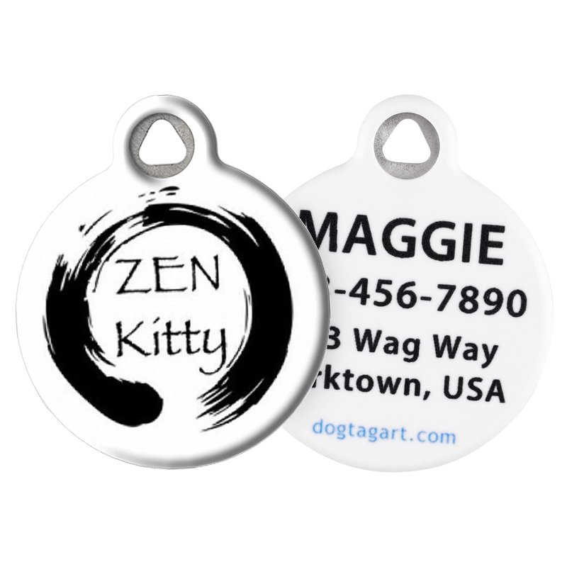 Dog Tag Art Zen Kitty Cat ID Tag The Dog Tag Art Zen Kitty Cat ID Tag is perfect for any cat. All cats are known for their ability to go into a meditation-like state of quiet bliss when curled up on the window ledge leaving us wishing we come back as a cat in our next life! Dog Tag Art pet tags are made of high-quality recycled stainless steel and are each permanently infused with full-color graphics and personalized text so they won't rub off over time, unlike cheaper competitors' tags. Our cat tags are fully customizable with your pet's name, your phone number, and other vital information. Our cat name tags also have a strong key ring, so you'll have everything you need to attach it to your cat's collar easily. You can personalize our fun pet ID tag for just about anything. Use them traditionally as cat ID tags or place one on your key ring with your house key, or attach them to your school backpack, purse, or luggage for a fun, colorful flair. Dog Tag Art pet tags are illustrated and designed by artists from around the globe and are entirely made in the USA. With our innovative infused design, there are no glued or "sandwiched" materials that quickly wear out or fall apart. These pet ID tags are especially great for puppies and kittens who can get away from you fast and get lost. Our dog ID tags come in 2 sizes: large - 1.25" (32 mm) in diameter, about the size of a half-dollar, and small - 7/8" (22 mm) in diameter, about the size of a nickel. The small dog tags for pets are best for cats and little dogs, while the large size is more suitable for medium and large dogs. To customize, add your personal contact information. Enter your custom text by selecting the "customize now" button. You have up to 4 lines of text for the back of your custom dog tag for pets, with 20 characters on each line. Purchase and personalize unique cat name tags for every pet in the family!