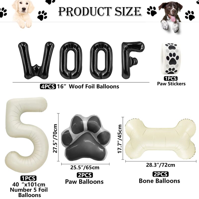 - What You Get: This puppy party decorations set includes 2pcs paw foil balloons(25.5 x 27.5" / 65 x 70cm), 2pcs bone foil balloons(17.5 x 29.5" / 45 x 75cm), 4 pcs w-o-o-f letter balloons(16"/ 40.5cm), 1 pc number 5 foil balloon(40" / 101.5cm), one roll of paw print stickers(1"/ 2.5cm, total 500pcs)