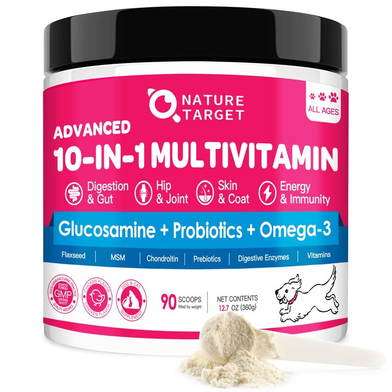 - Dog Multivitamin for Enhanced Support - Nature Target 10-in-1 dog vitamins and supplements provide well-round daily support for your dog. Combined with 10 key ingredients, it helps promote digestive, gut, joints, skin and immune health. In addition, the natural and tasty chicken flavor powder is great to be mixed into your dog's food. Each container provides a large capacity supply of 90 servings and it will provide overall protection for your puppy from head to paw and inside and out.