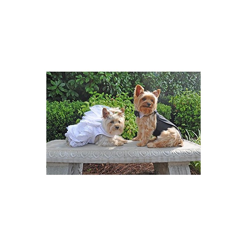 Your little bride will be so beautiful walking down the isle wearing this elegant fully lined, white satin and lace Bridal Gown Set. The gown has three tiers of skirting, each with an under-skirt of delicate white scalloped lace. The body of the dress is made from the highest quality white satin and is adorned with delicate white chiffon flowers, with pearl beads in the center. Each of these adorable little flowers has been hand sewn onto each of the three layers of skirting. This bridal gown set also comes with a matching wedding veil. The veil has a matching white satin head band, also adorned with the chiffon and pearl bead flowers and six layers of high quality Tulle. The six layers of Tulle can be separated to make this beautiful wedding veil very full and elegant (Picture shown with tulle layers separated). This set also includes a matching White Satin Leash. Available in sizes: XXS thru 2XL We have added a strip of Super Strong Nylon down the center, where the D-Ring is attached, for strength and security.