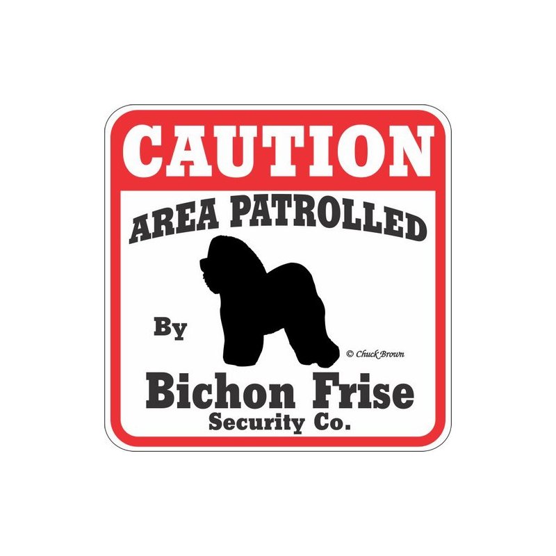 This "Caution Area Patrolled by " Bichon Frise sign is a great way to let everyone know you have a Bichon Frise patrolling your property. The Caution Area Patrolled signs are screen printed on UV protected Styrene with UV inks. These 11" x 11" signs are weather resistant and suitable for outdoors. Made in the USA. Making them the best Bichon Frise gift on the market.