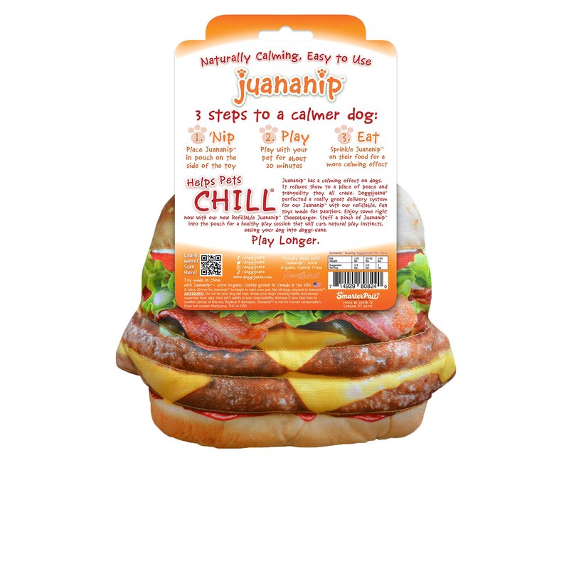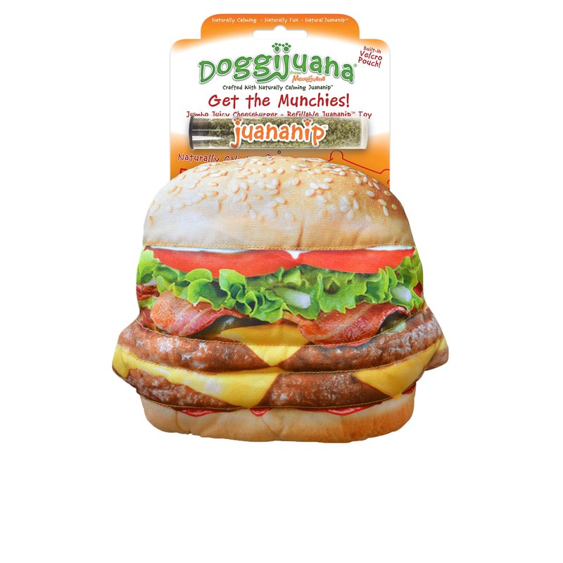 Juananip has a calming effect on dogs. It relaxes them to a place of peace and tranquility they all crave. We've perfected a really great delivery system for our Juananip with our refillable, fun toys made for pawtiers. Enjoy some right now with our new Refillable Cheeseburger Toy. Stuff a pinch into the pouch for a healthy play session that will ease your dog into doggi-vana. Play Longer. Get The Munchies Refillable Cheeseburger Toy is specially formulated to provide your furry friend with a sense of calm and well-being. Perfect for dog owners looking to ease their pet's anxiety, this product uses all-natural ingredients that dogs love. Whether you have a large dog or a multi-dog household, Get The Munchies Refillable Cheeseburger Toy will become your go-to solution for a happier, more relaxed pet. Say goodbye to stressful situations and hello to a contented pup with Get The Munchies Refillable Cheeseburger Toy. Catnip aka Juananip is safe, effective, and approved by veterinarians. This product is sure to be a favorite in your home.