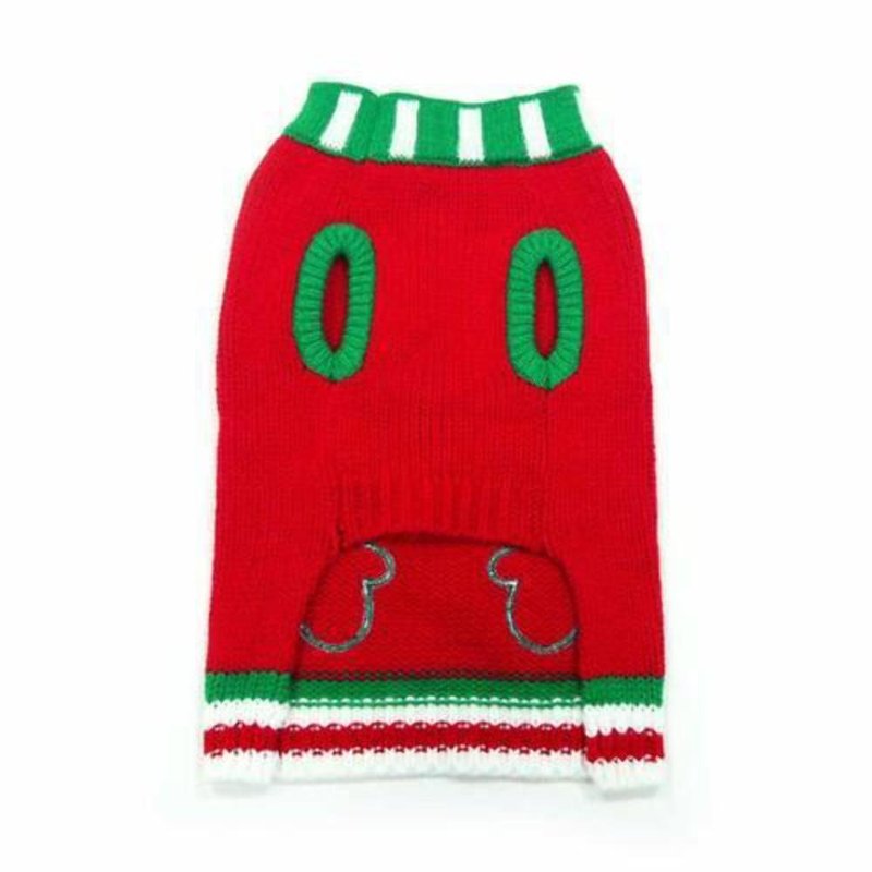 - Dogo red dog sweater with green and white scarf, with the cutest green mittens and a leash hole on the back.