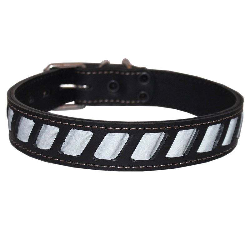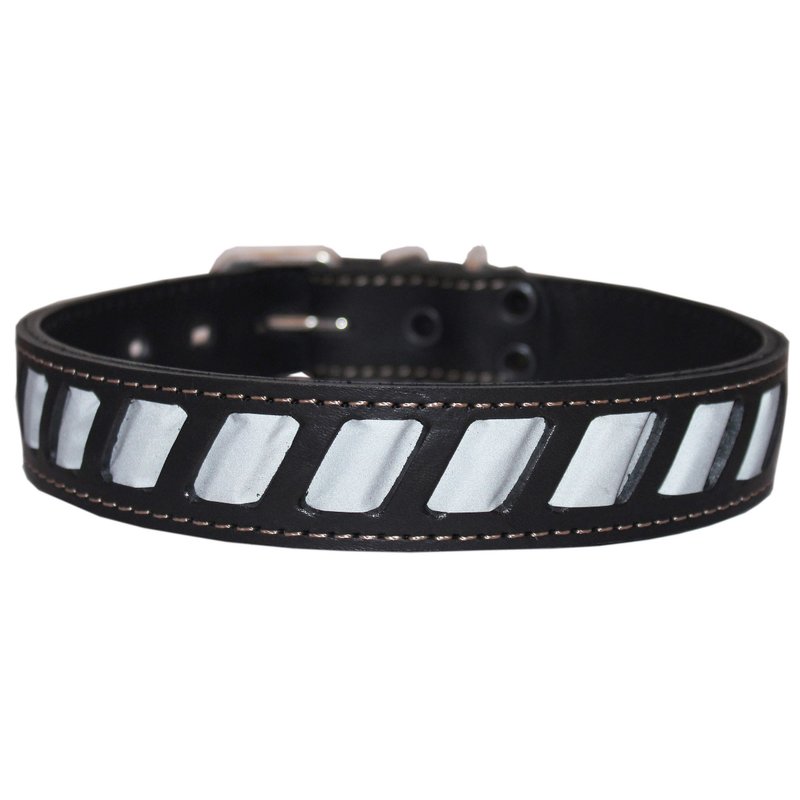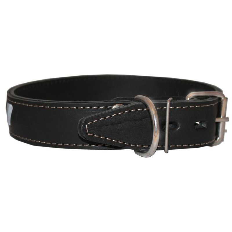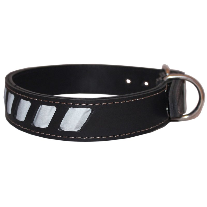 This durable collar is made of two layers of high quality genuine leather with braided in 3/4" wide reflective stripe to enhance visibility during the day as well as at night. Trimmed with contrast color thick waxed thread. Designed with the safety and comfort of your dog in mind, made to last. Most suitable for Large breeds.