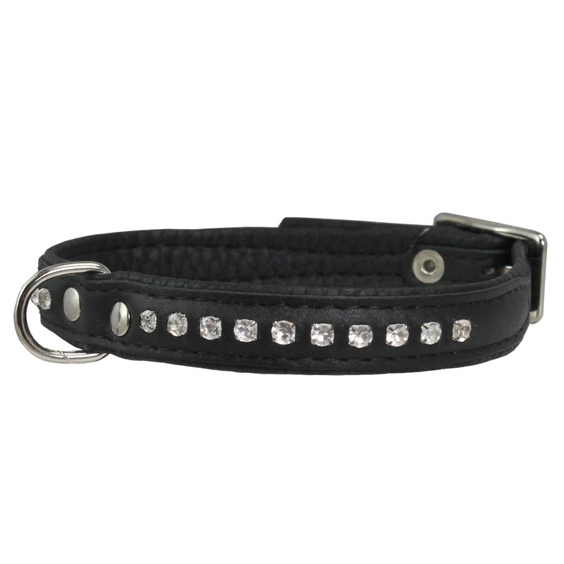 Gorgeous high quality dog collar. Pliable and strong, trimmed with thick waxed thread. Top surface made of high quality 100% genuine leather. Soft and comfortable black leather oversized padding. Crystal clear, sparkling rhinestone crystals are individually set. 1/2" wide. Features nickel-plated buckle and riveted center D-ring. 5 holes for adjustment. Available in 4 sizes and 6 color options. Designed for X-Small and Small dogs. Please measure dogs neck to ensure you order the correct size.