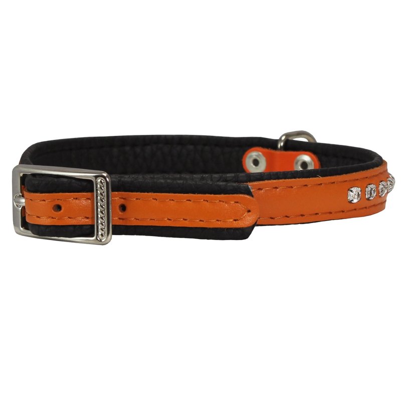 Gorgeous high quality dog collar. Pliable and strong, trimmed with thick waxed thread. Top surface made of high quality 100% genuine leather. Soft and comfortable black leather oversized padding. Crystal clear, sparkling rhinestone crystals are individually set. 1/2" wide. Features nickel-plated buckle and riveted center D-ring. 5 holes for adjustment. Available in 4 sizes and 6 color options. Designed for X-Small and Small dogs. Please measure dogs neck to ensure you order the correct size.