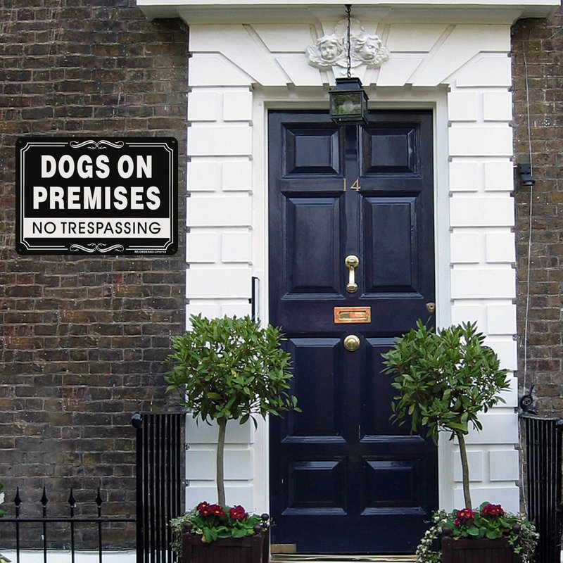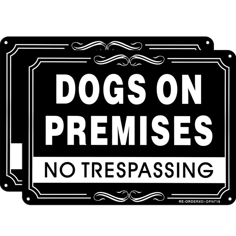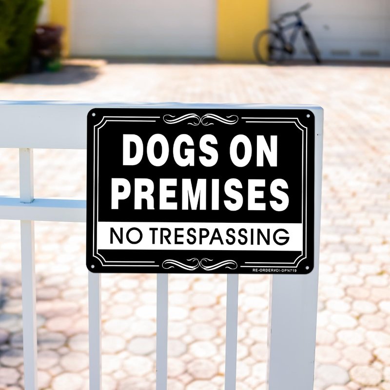 - EASY TO INSTALL: Dogs On Premises No Trespassing Sign have 4 pre-punched holes for easy mounting on every surface including walls, fence, poles and gates.