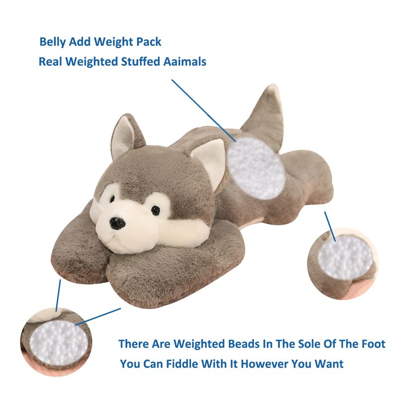 - FILLING: Husky plush toy add weighted bag design to the abdomen, with weighted particles and down cotton on the forefoot and sole of the foot, exquisite workmanship, full filling, delicate stitching, cute expression.