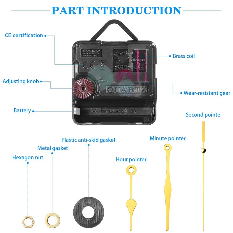 - đăPackage Includingă1Ăclock movement, 1Ăhour hands, 1Ăminute hands, 1Ăsecond hand and some mounting hardware. (No Battery)