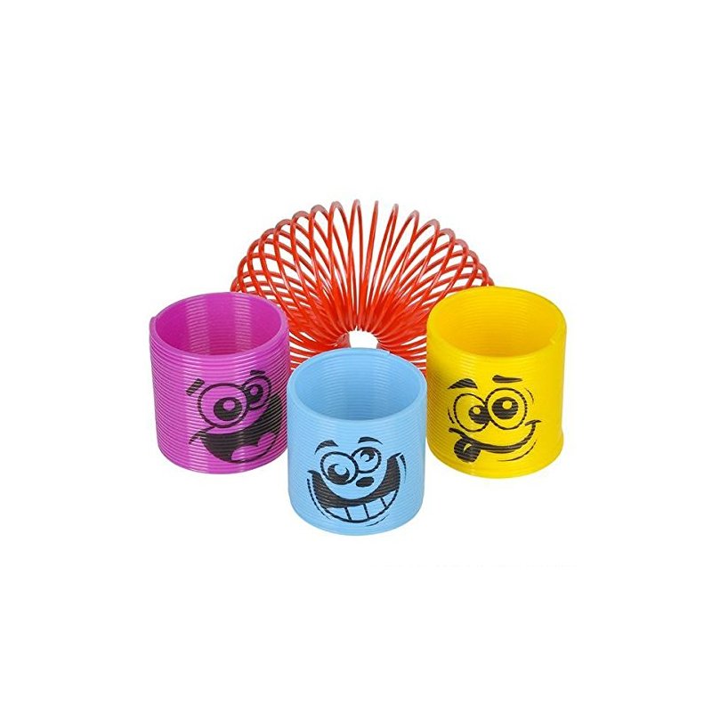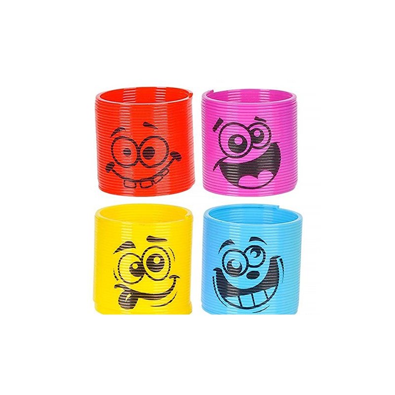 A fun party favor and carnival prize. This collection of miniature coil spring toys features smiley face prints in a variety of colors. 50 pieces per unit. For ages 3+.