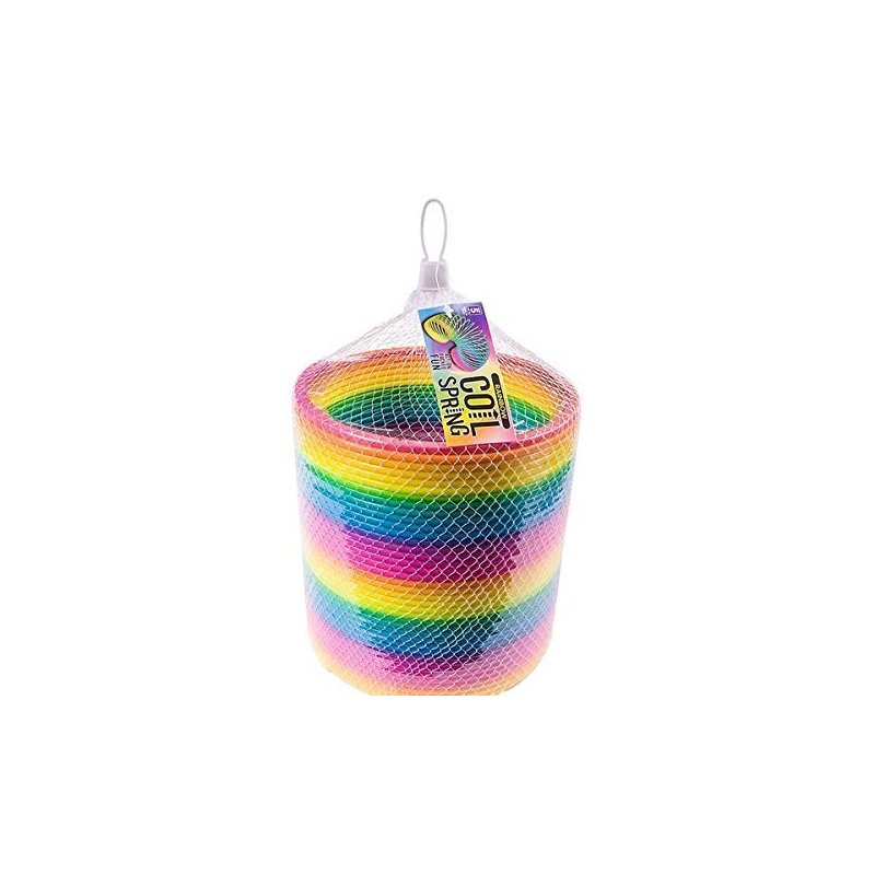 A vibrant addition to any wild party. This plastic coil spring toy features a vivid rainbow design scheme. Each piece in netted bag with hang tag.