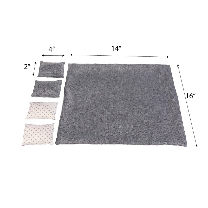 - Dimensions: The comforter is 16" x 14". Each pillow is 4" x 2". Please refer to the photos for more information regarding dimensions. This set can fit queen and twin beds. All pieces are made in the 1:6 scale, and are washable.