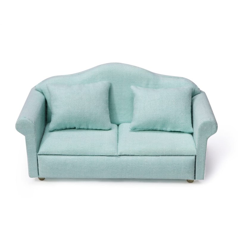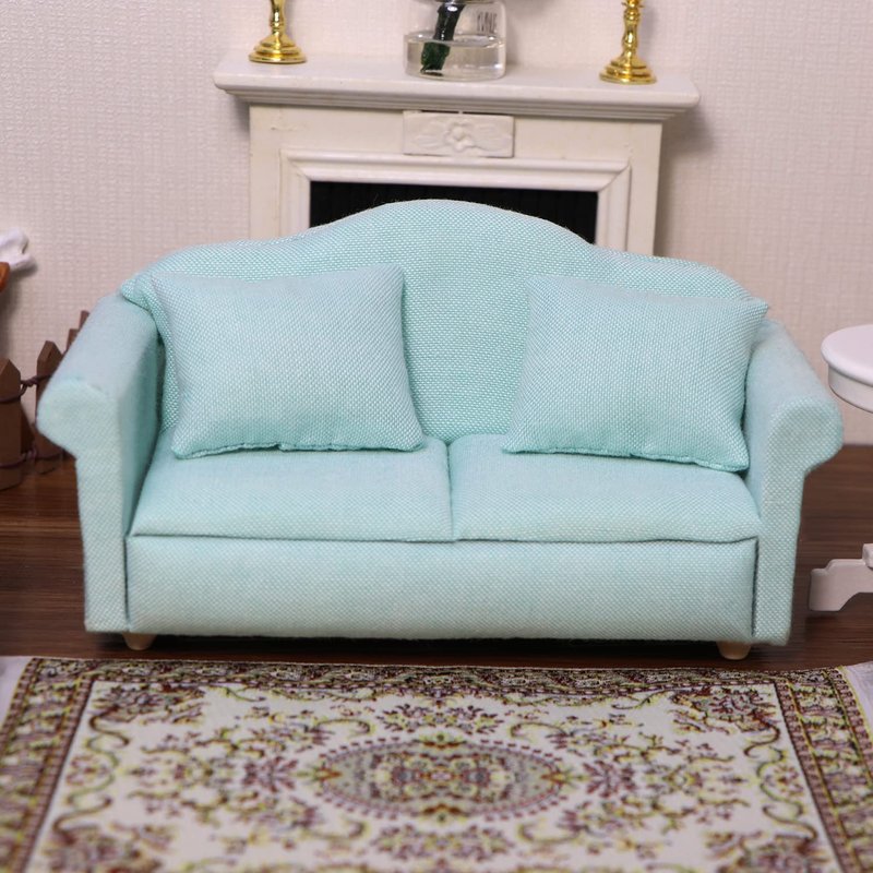 Dollhouse Couch Miniature Furniture Sofa with Pillows for Living Room Desktop Decoration Fabric Sofa Mini Home Scene Accessories Ornament (Double Sofa, Green)