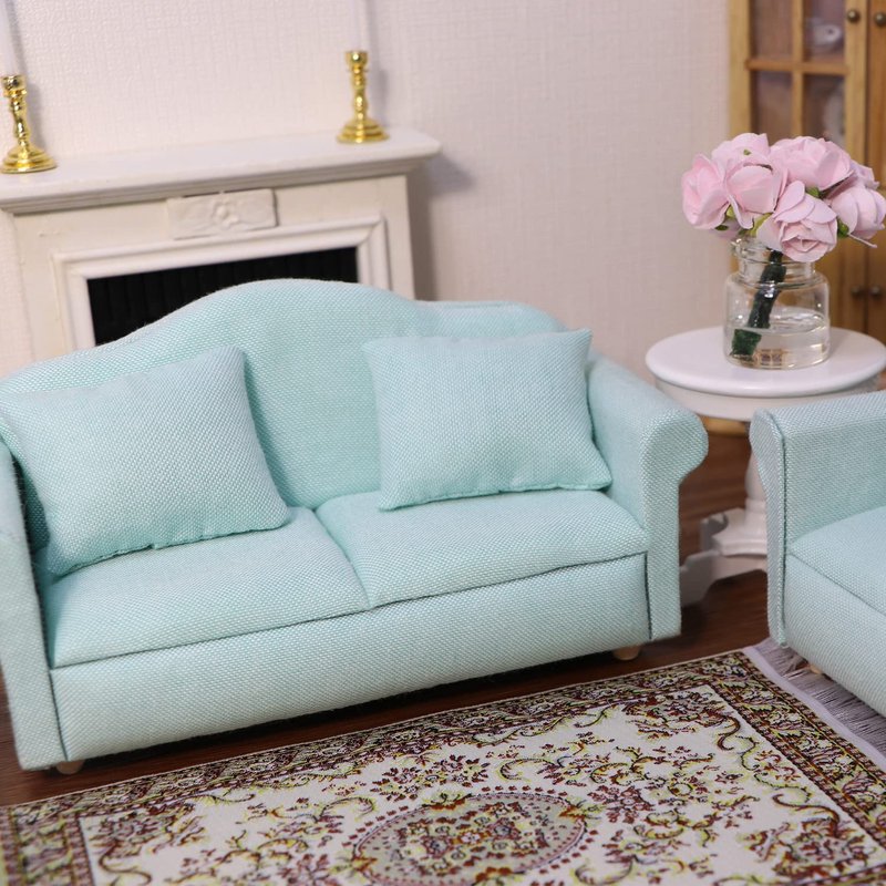 - ✿This miniature double sofa is well crafted in both craftsmanship and appearance and is perfect for dolls house decor. The fabric is lovely, matching two pillowthe, cushions are well made and the colours are gorgeous.