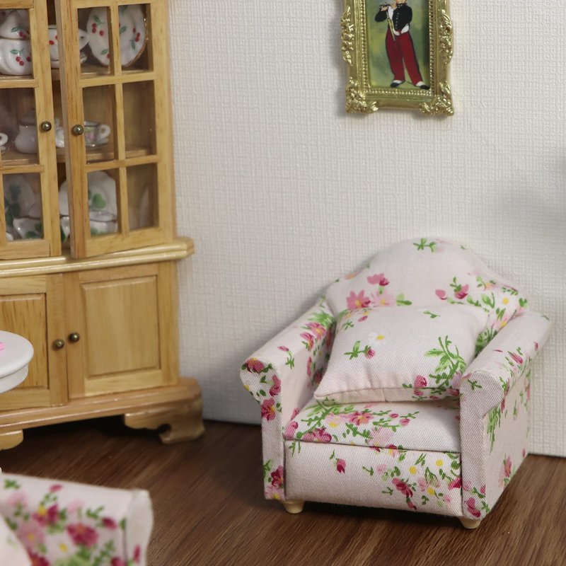 Dollhouse Couch with Pillow 1 12 Scale Miniature Sofa Arm Chair Living Room Furniture Wooden Fabric Frame Single Reading Chair Artificial House Room Scene Decoration (Pink)