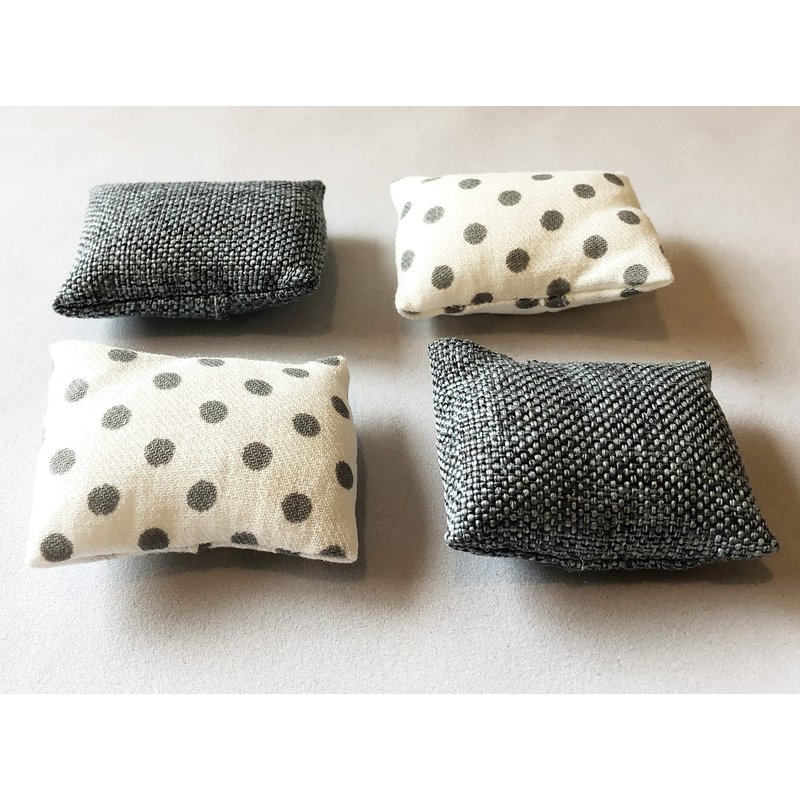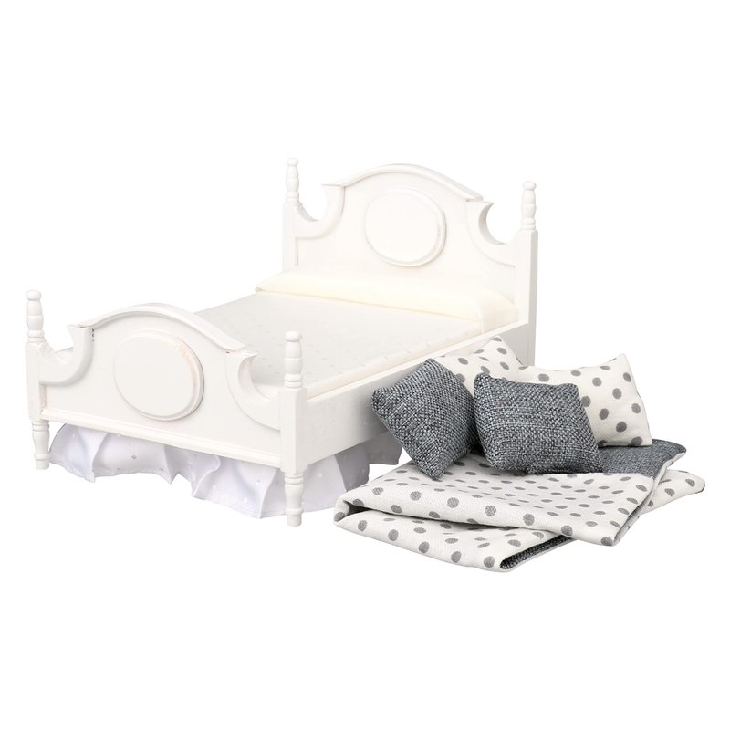 Dollhouse Furniture Mini Bed Set, Realistic Bedroom Accessories for 6 inch Dolls, Decorative Grey Bedspread & Pillows, White Wooden Frame, 1/12 Scale