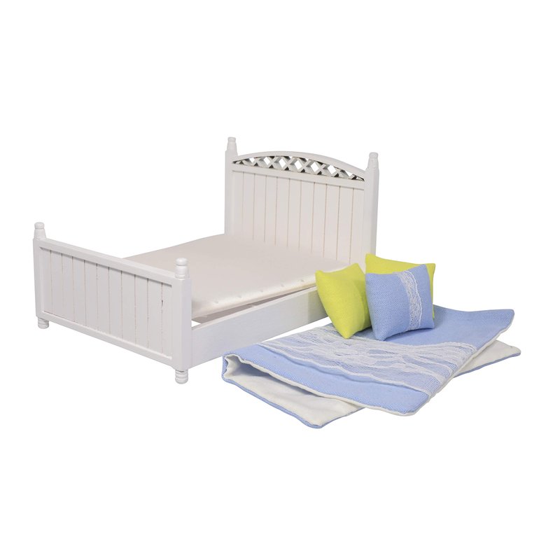 - Full Bed Set: Each set includes a wooden doll’s queen bed along with mattress, bedspread, and three decorative pillows; making it the perfect choice for adding a classy and elegant touch to your miniature doll house décor.