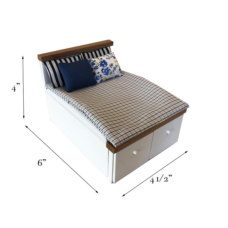 - Carved Details: This small modern doll house bed has two functional drawers at the foot of the bed. There are two brown decorative wood strips on the headboard and footboard make sure they don’t just look good but more realistic as well. The bed frame is painted in white.