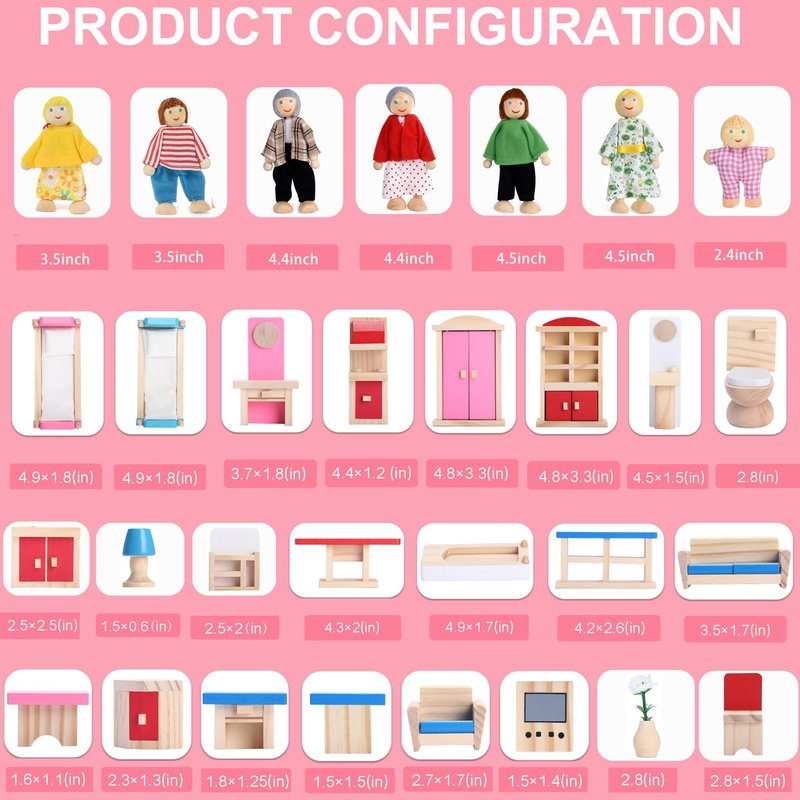 - Amazing Furniture Combination: 35-piece colorful complete well-made wood dollhouse furniture set with all the accessories; 7 different ages family dolls will add more fun to this furniture.