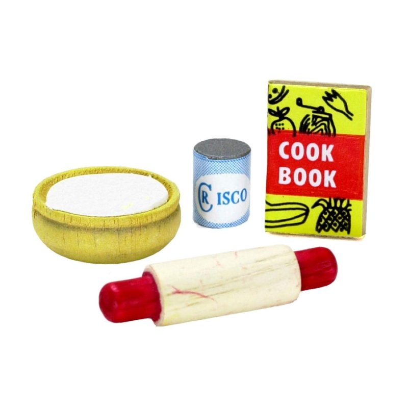 This bread baking set will make a nice addition to your miniature scene. The cookbook contains no pages and cannot be opened. The dough cannot be removed from wood bowl. Rolling pin is made of painted wood. Shortening is not an actual can and cannot be opened. This item is not edible. Do not attempt to eat or drink. Dimensions, rolling pin: 1-1/2"L x ¼" diameter. 1" to 1'. 1:12 Scale. This is sized for a dollhouse. Detailed scale model for adult collectors. Not intended for children under 14.