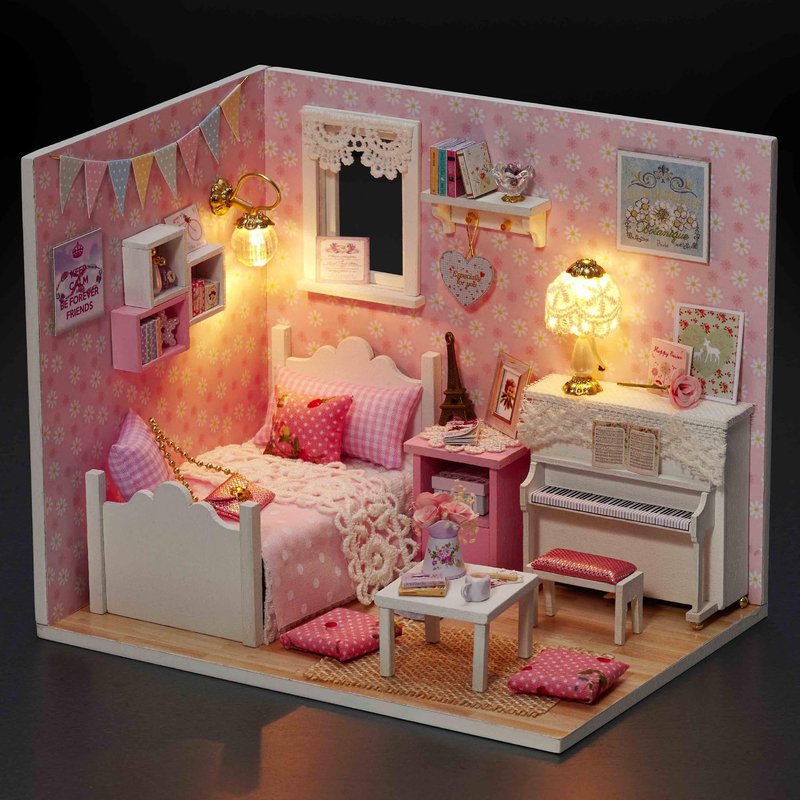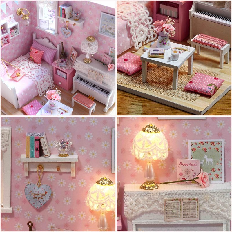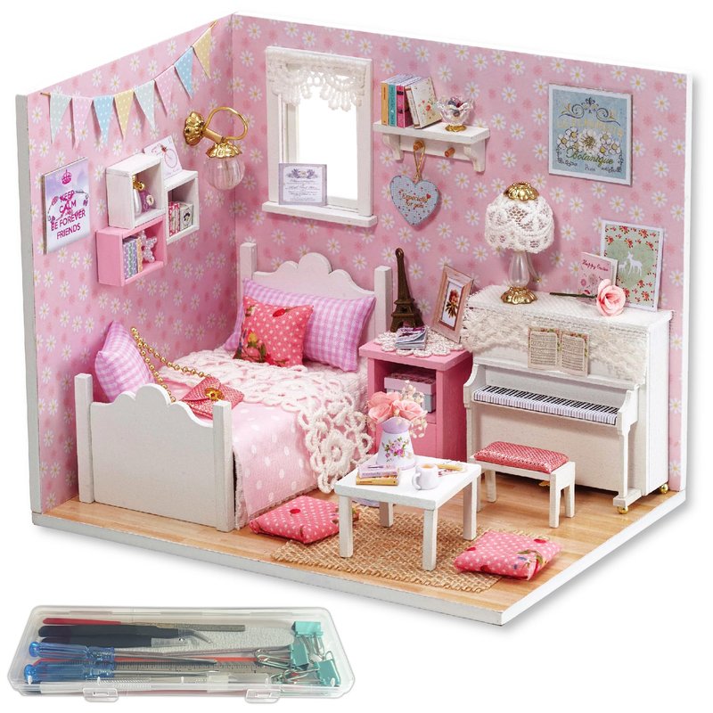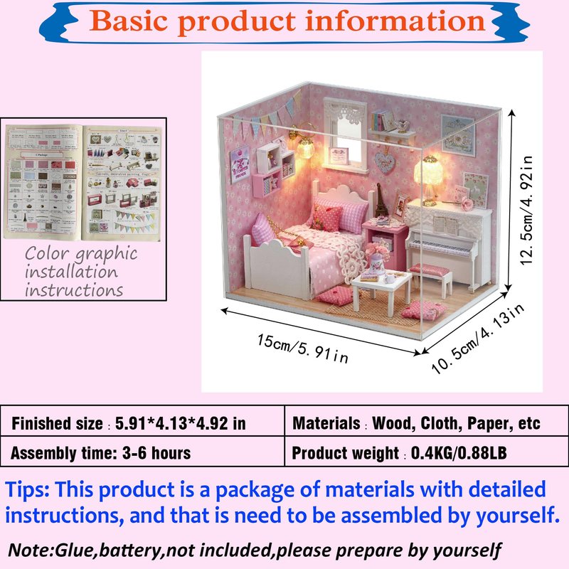 Features: DIY Miniature Dollhouse - Pink Sunshine Princess Style. DIY miniature doll house components are creative and meaningful gifts for graduation, homecoming, Halloween, Christmas, Valentine's Day or birthday! Composed of wood, simulated plants, cloth, plastic, metal and paper etc.. All DIY kit materials are eco-friendly and safe. Step-by-step diagrams and instructions in English. Tools Kit attached, and that are NECESSARY for your DIY. Warm Tips: You need to glues and two batteries (type AAA), because that are prohibited to shipped. Specifications: Product Name: Pink Sunshine Princess Finished Size: 3.5x3.5x4.5 inches(L x W x H) Scale: 1:24 Weight: 0.2 KG Material: Made from non-toxic materials including wood, paper, fabrics, plastic, metal, and so on Recommended Age: Over 14 years old Assemble time: around one day, beginners might need more. Package include: Led Light: included Tool Kit: Included Dust cover: Included English manual for reference: included Battery: Not included Glue: Not included Music Box: Not included Notes: Glues AND batteries (Type AAA) ARE NOT included. This doll house is a kit of parts package, and you need to do it yourself. Suitable for kids over 14 years and adults. Tools kit and dust cover are included.