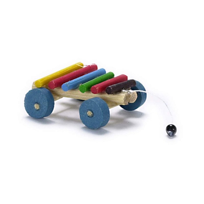 Adorable pull-along xylophone is ready for your miniatures children or just as a unique accessory. It is made of painted wood. Wheels rotate. Dimensions: 3/8"H x 1"W x 15/16"L. 1in to 1ft. 1:12 Scale. This is sized for a dollhouse. Detailed scale model for adult collectors. Not intended for children under 14.
