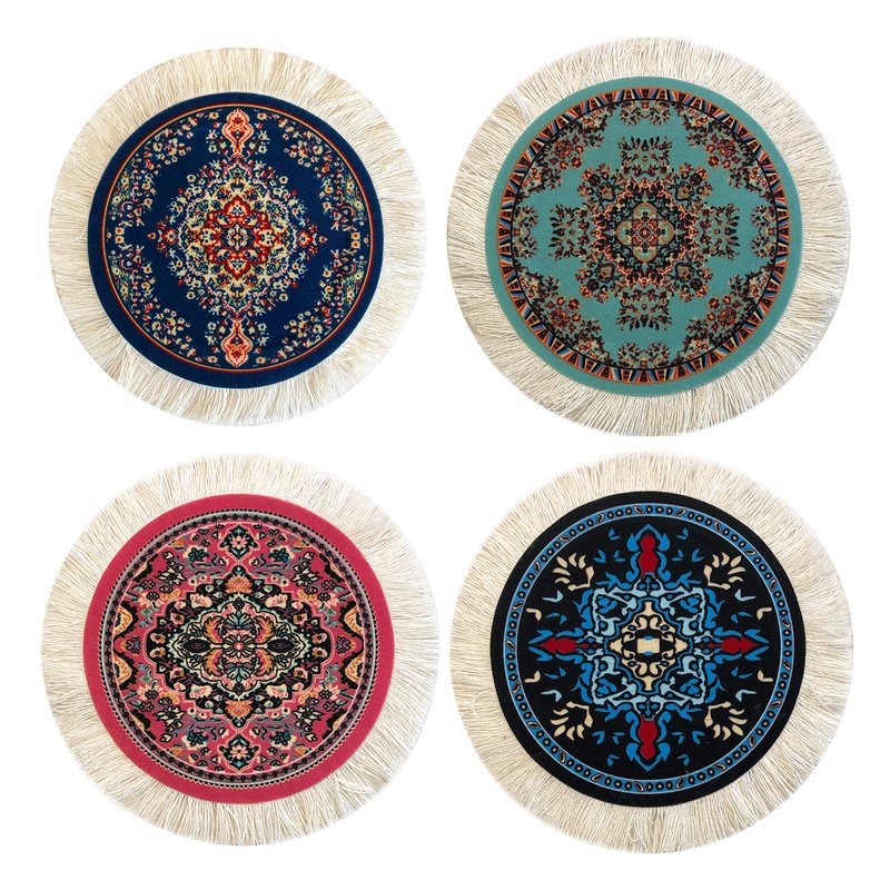 Oriental rugs have been famous for centuries. Now you have the opportunity to add miniature versions of these beautiful designs to your dollhouse. You will receive the four (4) rugs that are pictured. Product Details - Top of each rug has a soft, velvety feel with a unique and authentic Oriental rug design - White fringes long the edge - Bright colors that do not fade - Carpet is washable - Detailed design of authentic Oriental Rugs - Size including fringes: 5" diameter