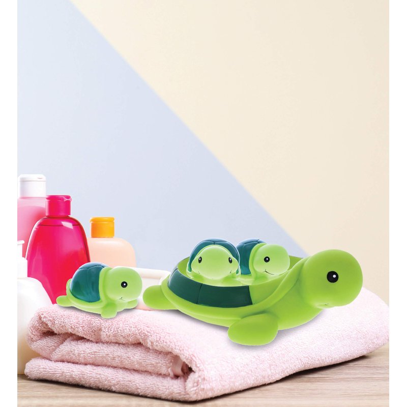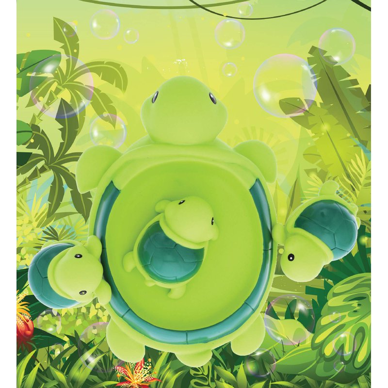 - INCLUDED WITH PURCHASE OF BATH SQUIRTERS SET - Includes 1 Dollibu Sea Turtle Animal Family Bath Squirters 4 piece set packed inside a white mesh net. Green sea turtle toys have cute cartoon eyes, smiling face & 3 smaller turtle figures have a small hole in the middle of the mouth to squirt water from. The baby turtles are soft & fit perfectly on top of the firmer bigger turtle for easy storage! Big figure measures approx. 6.75"L x 5"W x 2.5"H & 3 smaller figures measure approx. 3"L x 2"H.