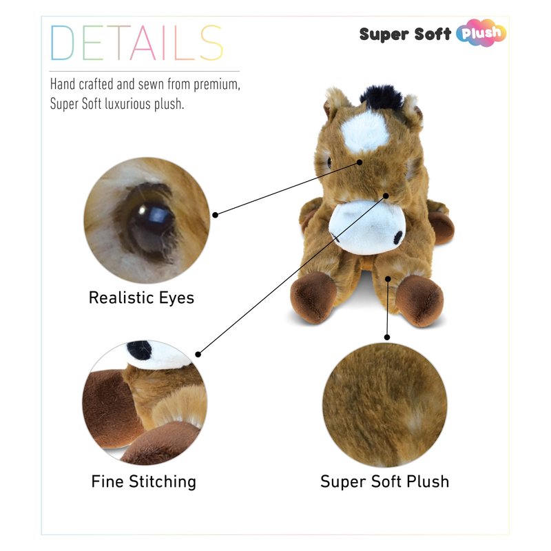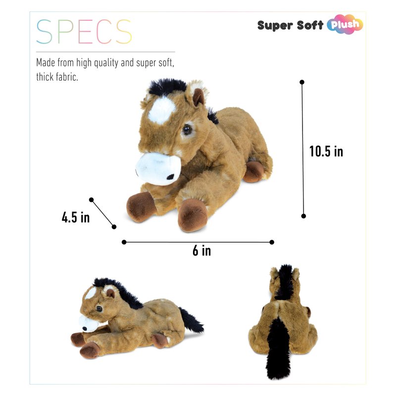 - HIGH-QUALITY HORSE STUFFED ANIMAL FOR GIRLS - The machine-sewn Lying Brown Horse toy is made of premium-quality super soft 100% polyester. Beautifully crafted with durable, child-friendly features. Huggable, snuggly plush baby toys horse in cute lying position. Super soft stuffed animals for girls and boys designed to be your little one's best buddy. To maintain fluffy stuffed animals, wash horse plush with cold soapy water and allow to air dry.