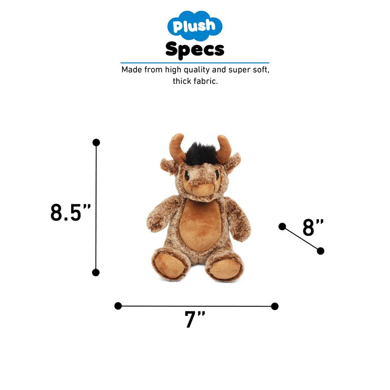 DolliBu Sitting Buffalo Plush is a safe stuffed toy for kids and toddlers of all ages. The cute plush animal will surely bring a smile to your loved ones who love wildlife animals, especially buffalos. Sitting buffalo will make a great addition to a kid's plush collection while couples can express their love by surprising their better half with a unique plush. Stuffed animals help develop a child's social skills, speech and creativity when enjoying imaginative playtime with their family. The stuffed sitting buffalo will be your little one's huggable plush doll BFF when playing, traveling, and learning. Anyone will love to receive cute stuffed animals like buffalo toys. Toddler boys and girls love to snuggle with a fuzzy stuffed toy. Soft stuffed animals are classic gifts for loved ones. Makes a sweet present for your partner on occasions like birthday, Valentine's Day, and Christmas. Send your regards to ill children and adults by giving them cute toy stuffed buffalo plush as get well presents. Includes 1 DolliBu SItting Buffalo Super Soft Plush, decorated with realistic features of cute plush and horns. Buffalo's body is of brown soft fabric that makes the plush perfect for cuddles and snuggles. The buffalo's eyes make the critter so charming. The machine-sewn sitting buffalo toy plush is made of premium-quality polyester, stuffed with super soft cotton fillings. Crafted with durable and child-friendly features. A huggable and snuggly critter with soft brown plush all around it. Cute soft toys designed to be your child pet buddies. To maintain fluffy stuffed animals, wash sitting buffalo toys with cold soapy water and allow to air dry. A must-have toy for family bonding and to add to your fairytale-themed room decor. Start collecting DolliBu's super cute plush from pets to zoo, ocean, jungle and safari wild animals. The lovely sitting buffalo soft plush toys measure 9" high, perfect for all ages.