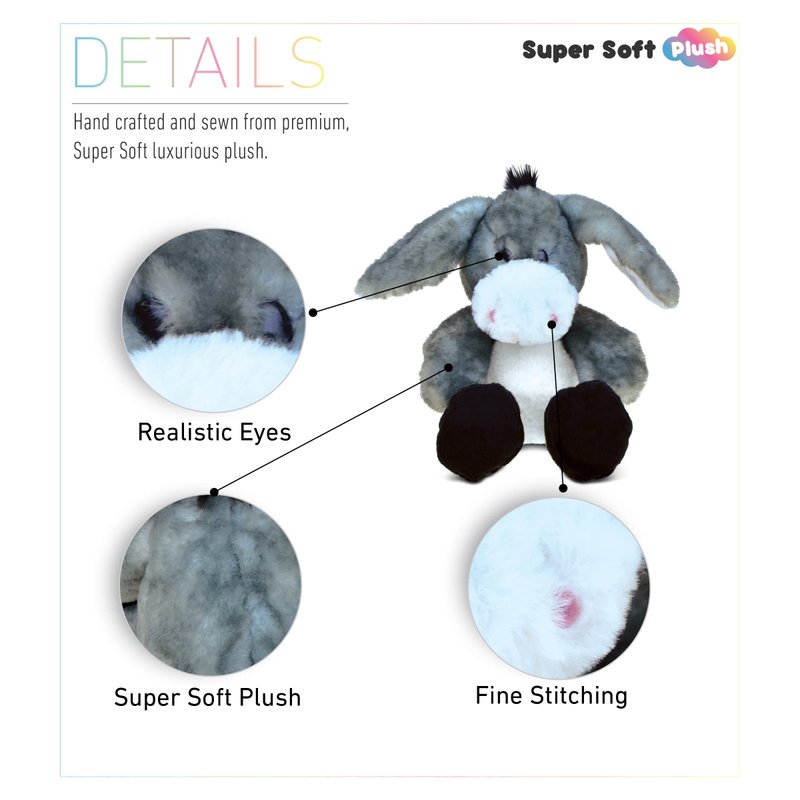 - HIGH-QUALITY STUFFED ANIMAL DONKEY - These donkey toys are machine-sewn fluffy stuffed animals. Made with premium-quality polyester and stuffed with soft polyester fillings. Crafted with durable and child-friendly features for an enjoyable playtime. A huggable, happy Donkey sitting upright will be your little one's best toy donkey plush buddy. Maintain a fluffy stuffed animal by washing it with cold, soapy water and allowing it to air dry.