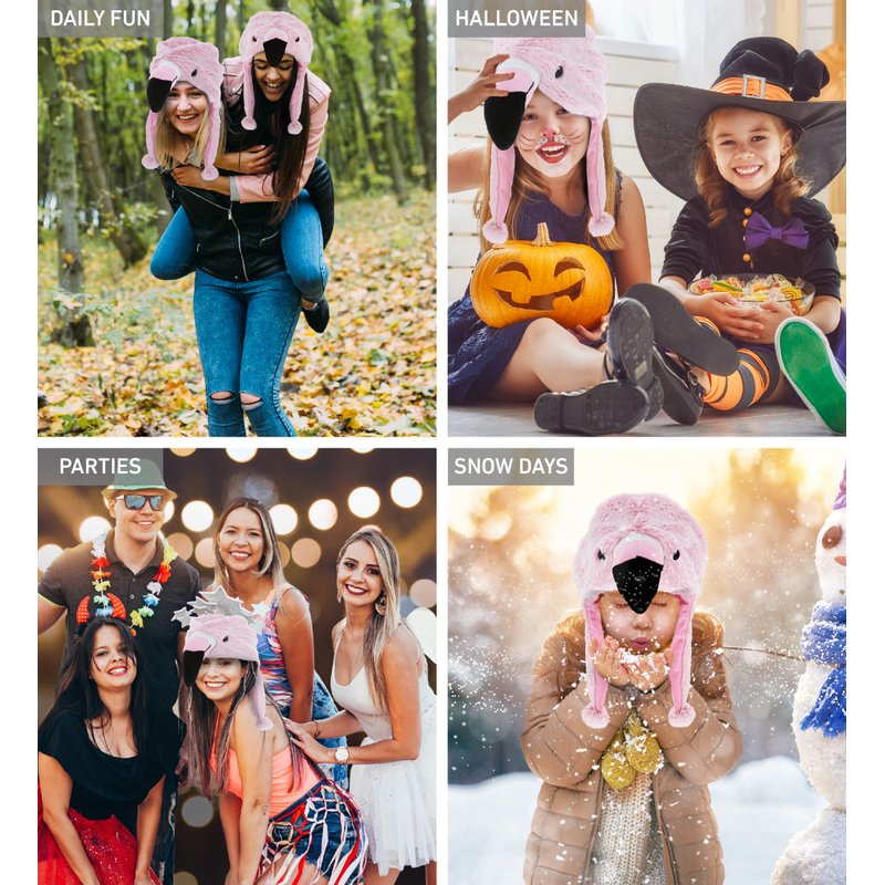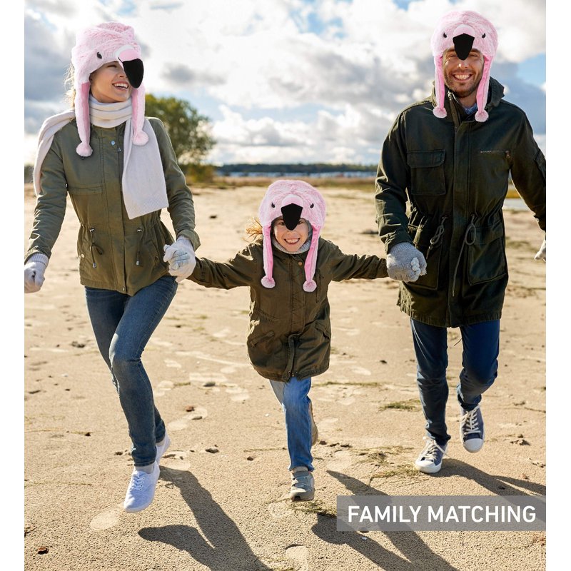 - THE PINK FLAMINGO HAT COMES WITH UNIQUE DESIGNS YOU WILL LOVE - DolliBu's Pink Flamingo Plush Hat With Ear Flaps will make your winter time comfy and warm. The pink flamingo winter hat features a cute plush animal perfect to pair with your kids' flamingo costume. Kids and adults can always bring this flamingo hats anywhere they go for an endless fun. A must-have pink flamingo costume adult and kids will love to use as Halloween party accessories.