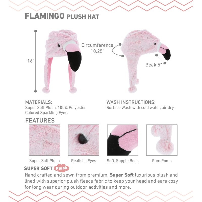 - HIGH-QUALITY STUFFED ANIMAL FLAMINGO HAT FOR KIDS - The flamingo hat kids and adults is made from 100% polyester, handcrafted, and sewn from soft fleece fabric to keep head and ears warm and comfortable for long wear during winter outdoors and indoor activities. With its thick plush, soft materials, the pink flamingo hat will surely last for seasons. Maintain cleanliness of the flamingo hat by hand washing with cold water and air drying only.